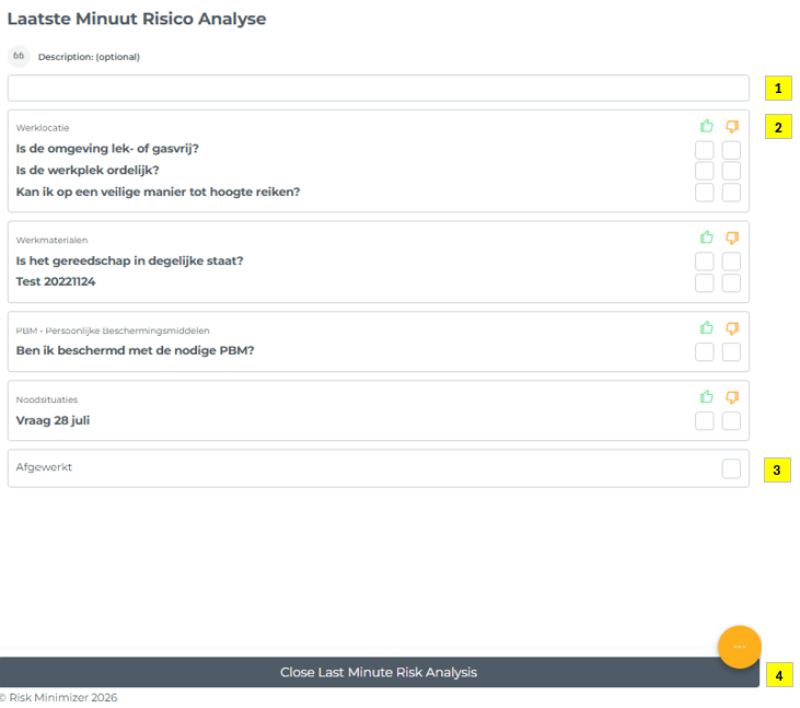 - Je kan een duimpje omhoog of omlaag geven. Bij een duimpje omhoog kan je optioneel een positieve melding koppelen. Bij een duimpje omlaag ben je verplicht om een onveilige melding aan te maken. Deze opent automatisch en na het aanmaken, kan je verder gaan met de LMRA.