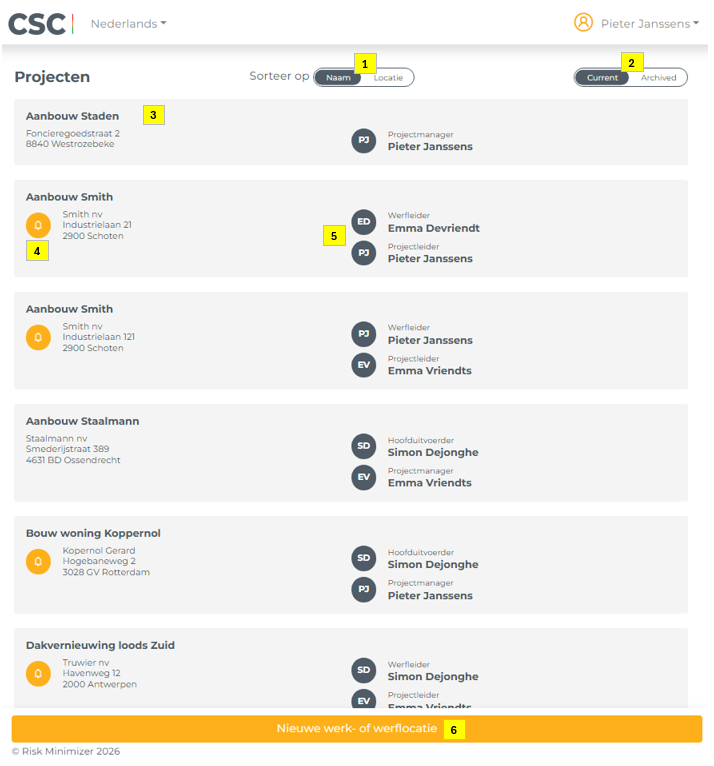 - Je kan projecten sorteren op naam of afstand. Alfabetisch op naam gebruik je bv als je op kantoor werkt, op afstand, als je op de baan bent want zo zie je de werven die het dichtst zijn als eerste.