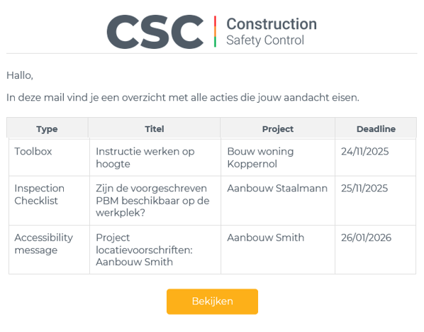 In CSC krijg je als gebruiker standaard elke dag een mail met een overzicht van jouw openstaande acties over der werven heen.