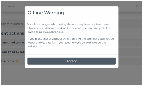 Dan krijg je op je computer de volgende popup. Belangrijk, open de CSC app op de smartphone zodat die terug online is en druk dan pas op de boodschap op jouw computer. Jouw uitgevoerde offline actie kan verloren gaan als je deze volgorde niet respecteert. Dit staat ook vermeld op de popup.